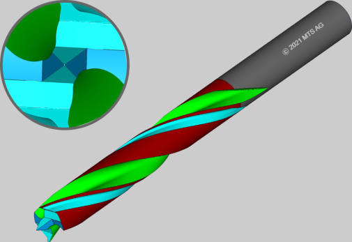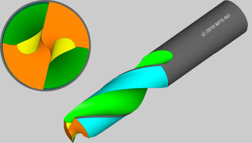 •Sonderanschliff mit 4 Zähnen/Nuten: Die 4 Hauptschneiden bestehen jeweils aus 4-Flächen-Anschliffen mit 4-Flächen-Eckenfasen. Die Hauptgruppe verfügt dabei über einem klassischen 4-Flächenanschliff, während die Nebengruppe verkürzte Zähne aufweist (analog zu einem 4-schneidigem Fräser mit 2-zum-Zentrum-Stirngeometrie).Forstner-Bohrer.•Der 2-stufige Giga-Drill besteht aus einerklassischen Mehrfasenbohrer-Geometrie.•Werkzeug: 6040017 „GIGA-Drill“