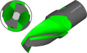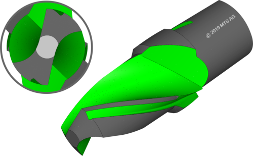 •Sonderanschliff mit 4 Zähnen/Nuten: Die 4 Hauptschneiden bestehen jeweils aus 4-Flächen-Anschliffen mit 4-Flächen-Eckenfasen. Die Hauptgruppe verfügt dabei über einem klassischen 4-Flächenanschliff, während die Nebengruppe verkürzte Zähne aufweist (analog zu einem 4-schneidigem Fräser mit 2-zum-Zentrum-Stirngeometrie).Forstner-Bohrer.•Der 2-stufige Giga-Drill besteht aus einerklassischen Mehrfasenbohrer-Geometrie.•Werkzeug: 6040017 „GIGA-Drill“